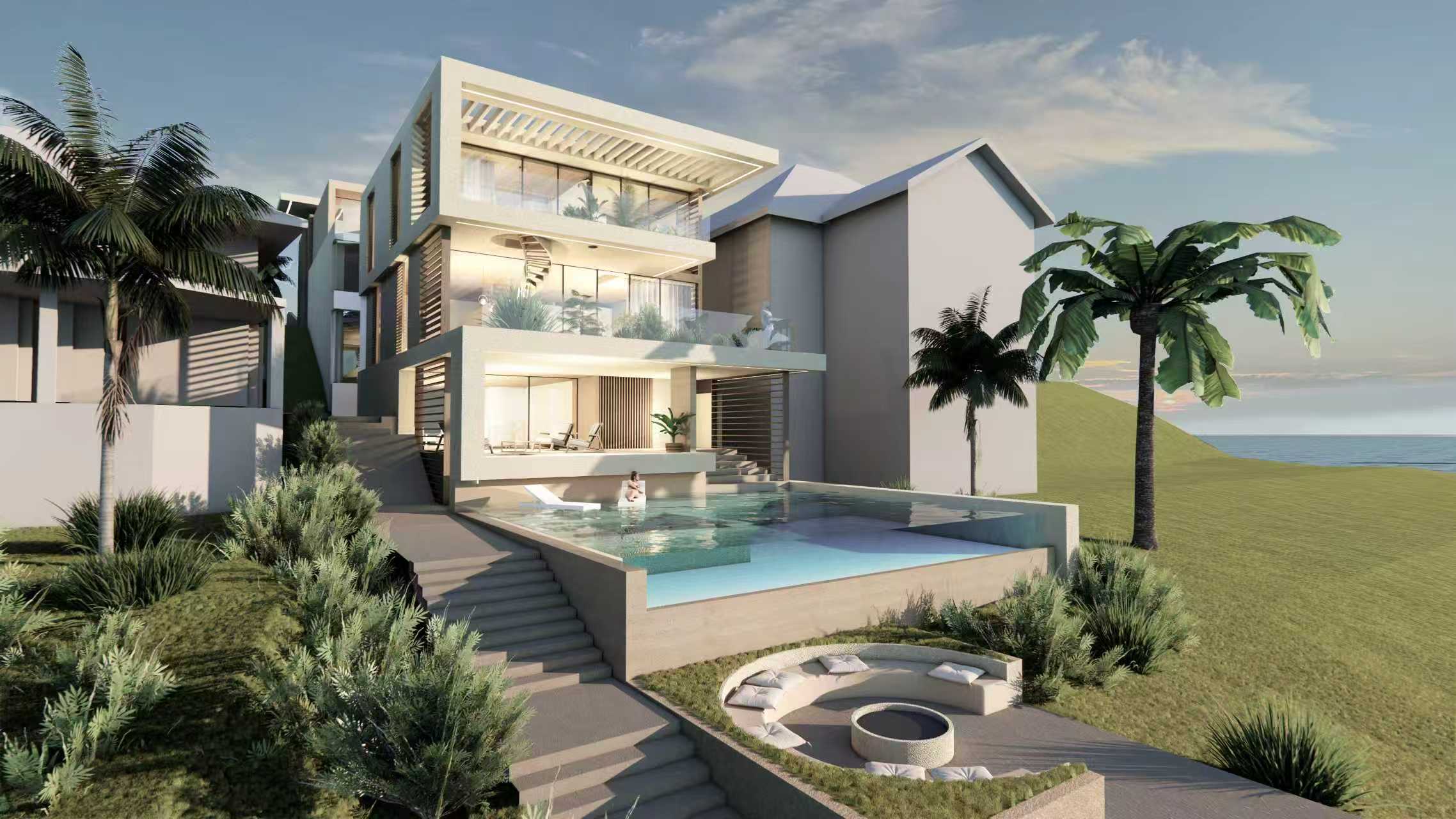 A three-level hillside retreat with stepped terraces, an infinity pool, and a sunken fire pit—creating a seamless indoor-to-ocean procession.