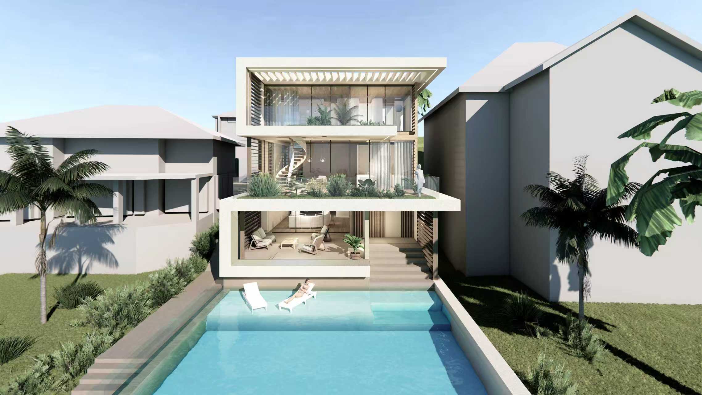 Three-storey residence with integrated living/dining, suites, and wellness zones