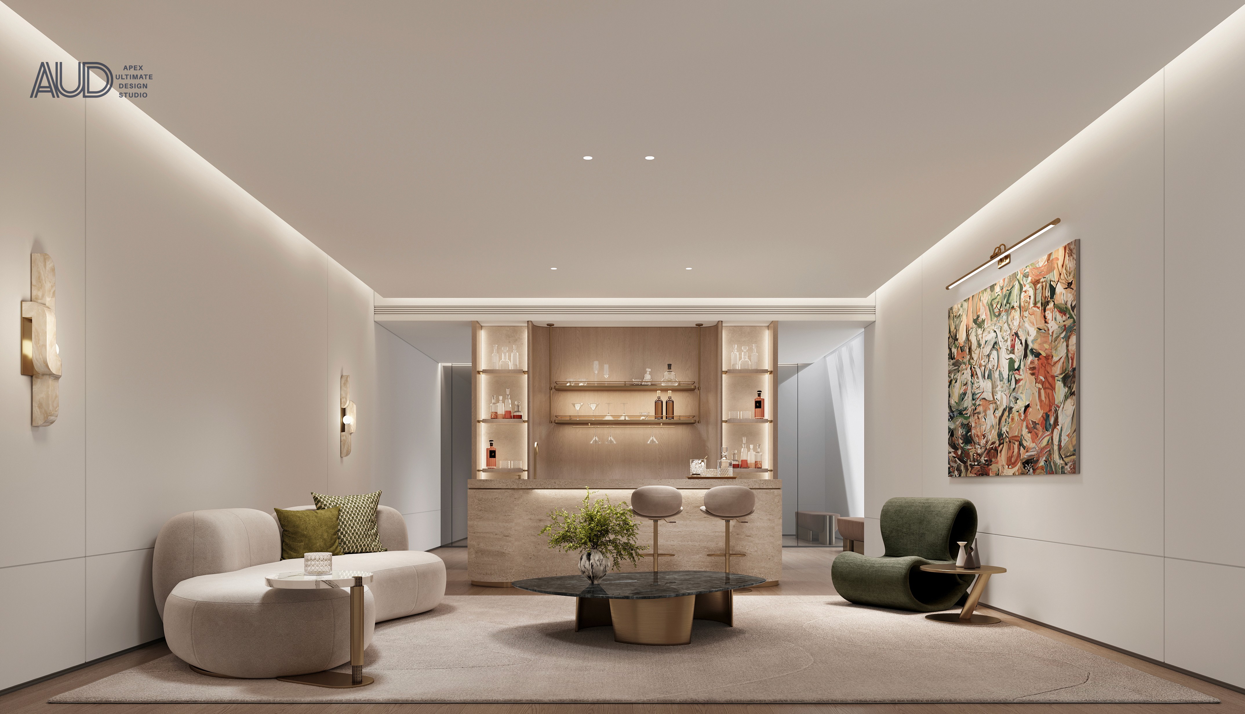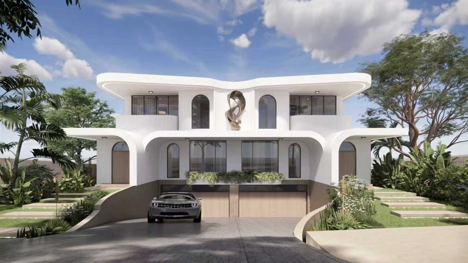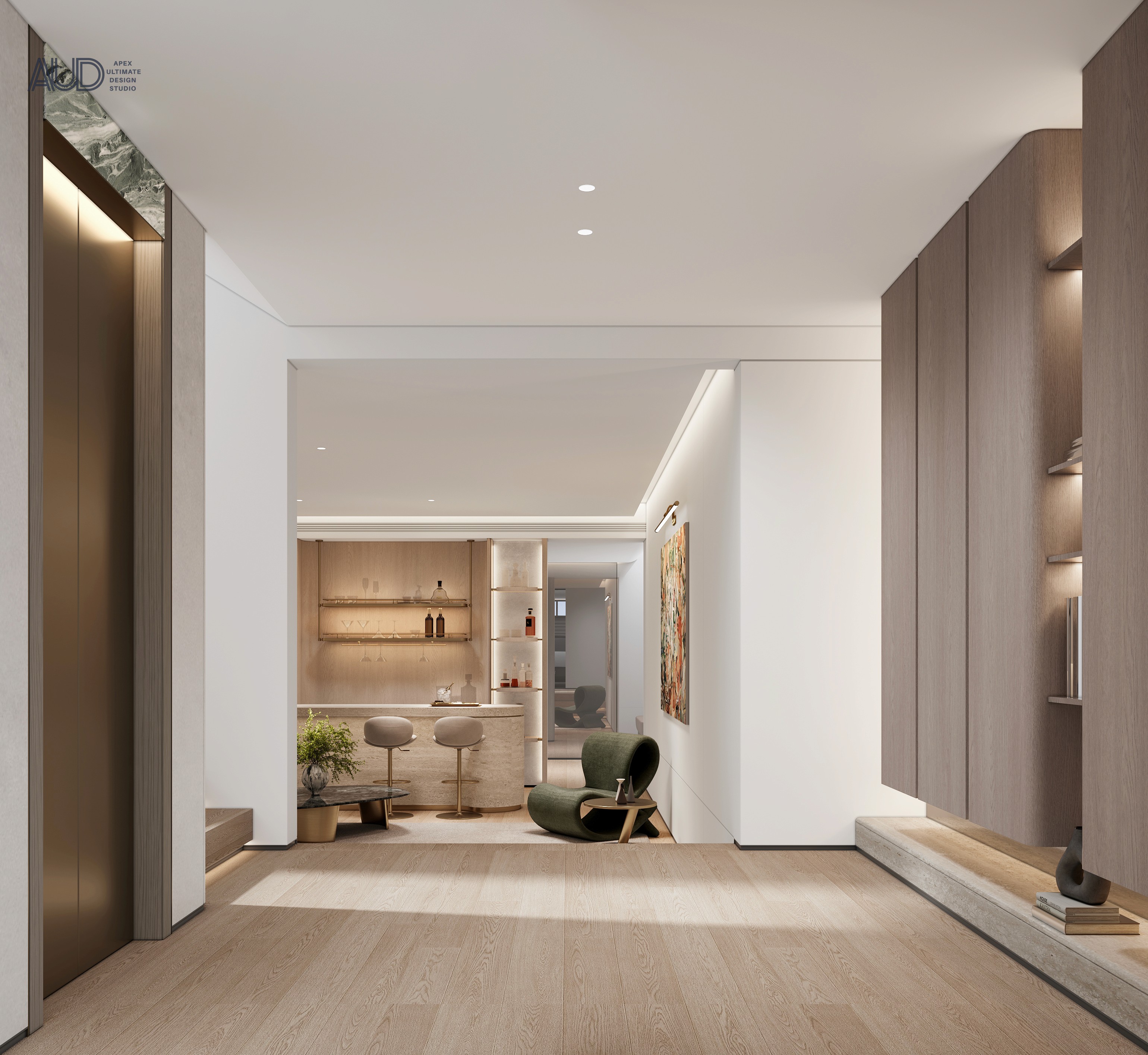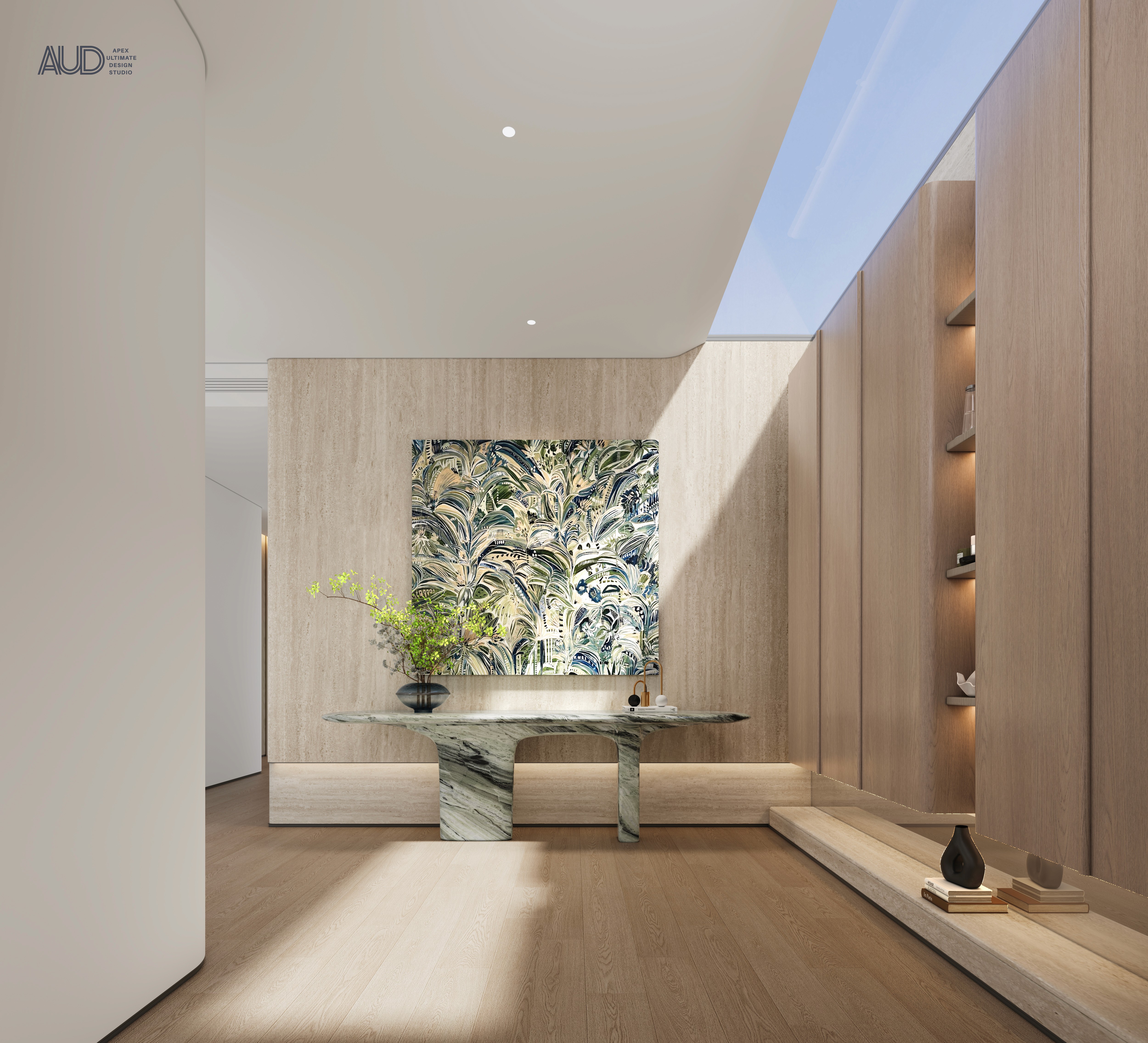 A collector couple envisioned an elegant residence with gallery-like presence and ceremonial arrival.